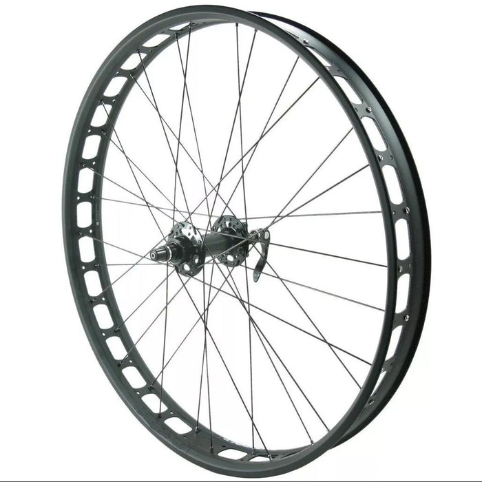 Blizzerk 70 rim is ready to accept your tubeless ready tape, valves and tires! 9mm x 135mm quick release front hub fits front disc spaced Fat Bike forks.